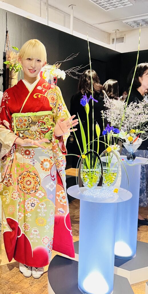 ↓昨年の花展オープニングで 華やかな振袖姿の🟥PORINさん 自分の作品と一緒に