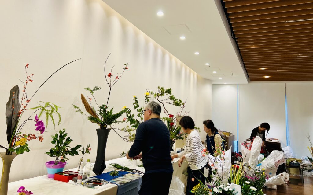 個人作品をいけ終えて 今回の花展指導をお願いしました 森部隆特命教授に指導をいただきながら 手直し手直しの後終了✨ ようやく 隣りのメンバーと話す余裕が出てきます