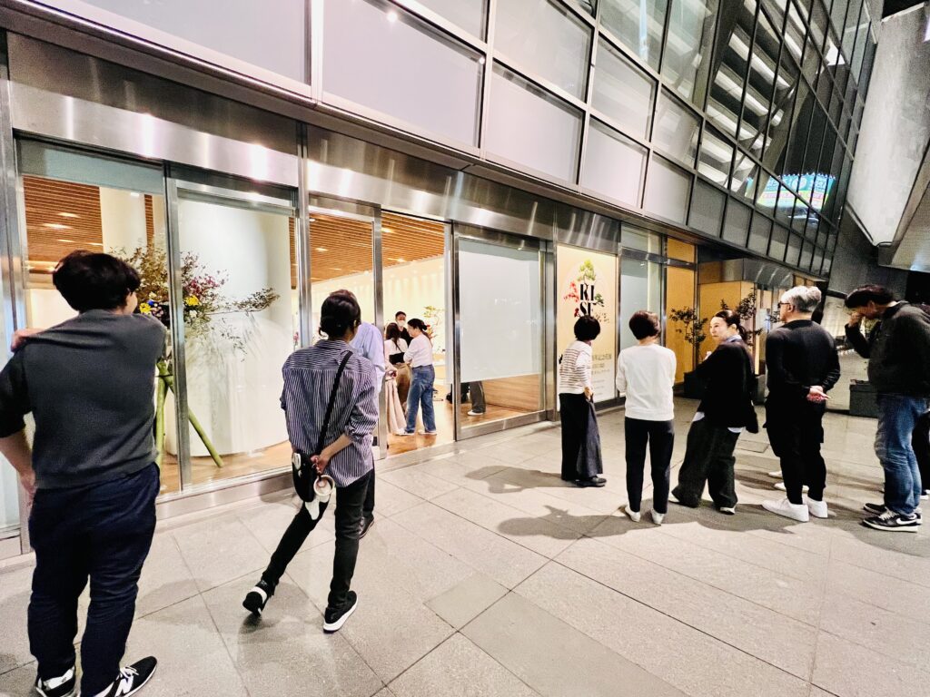 カフェ/スペースの 入り口外に 花展キービジュアルのサインボードが 貼られると皆外に集まり どよめきが、、