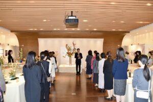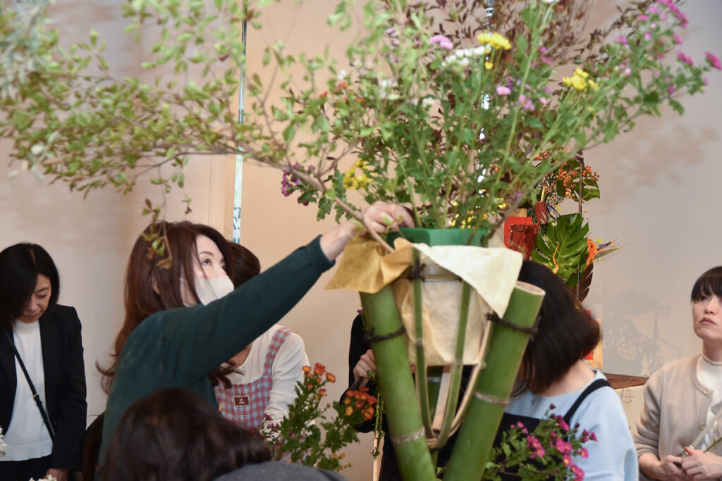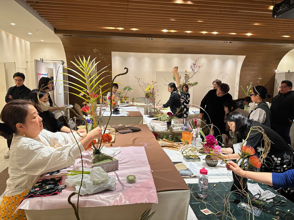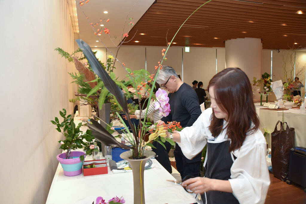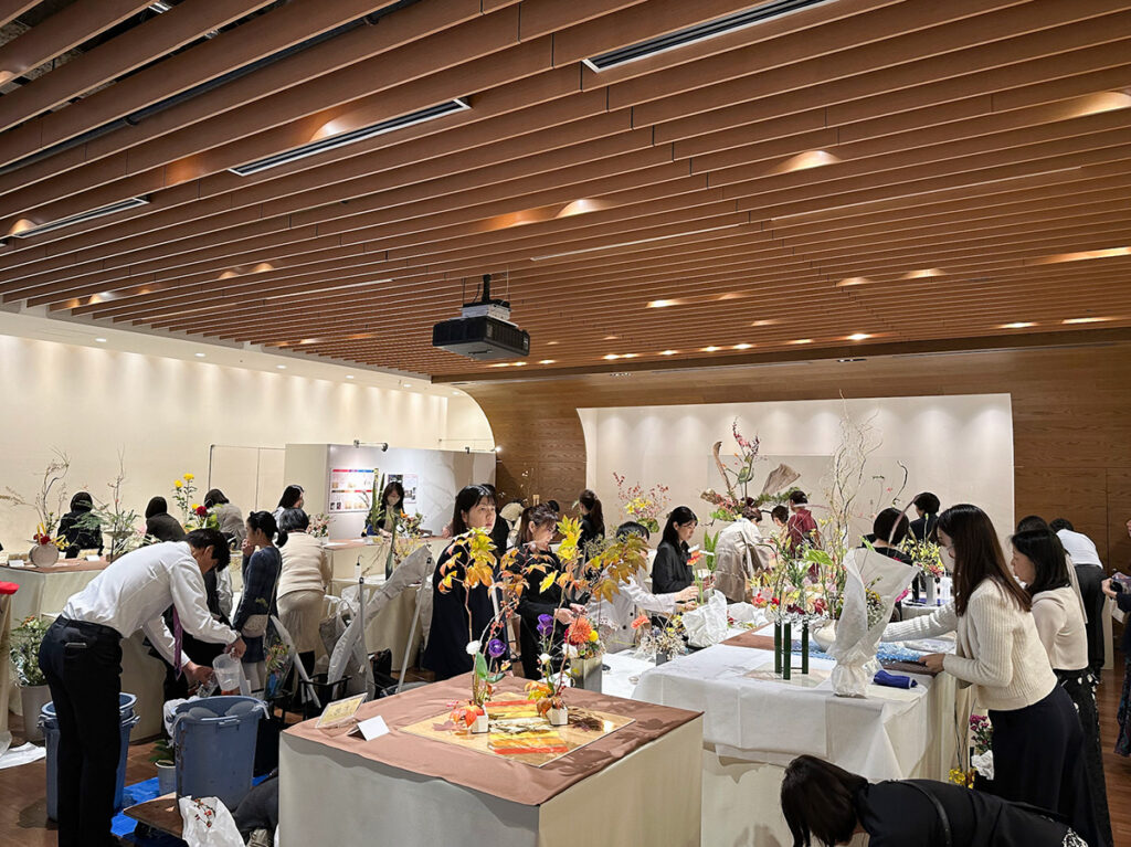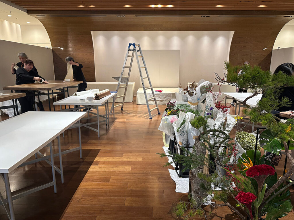 前期展のいけこみは 会場設営もあり 騒然として見えます 花展初参加のメンバーが多いため 緊張の中 真剣な静寂に覆われていました それでも 隣同士で挨拶したり わからないことを尋ね合ったり そんな交流も ここから始まります 不安と期待を胸に 花をいける そんないけこみ風景