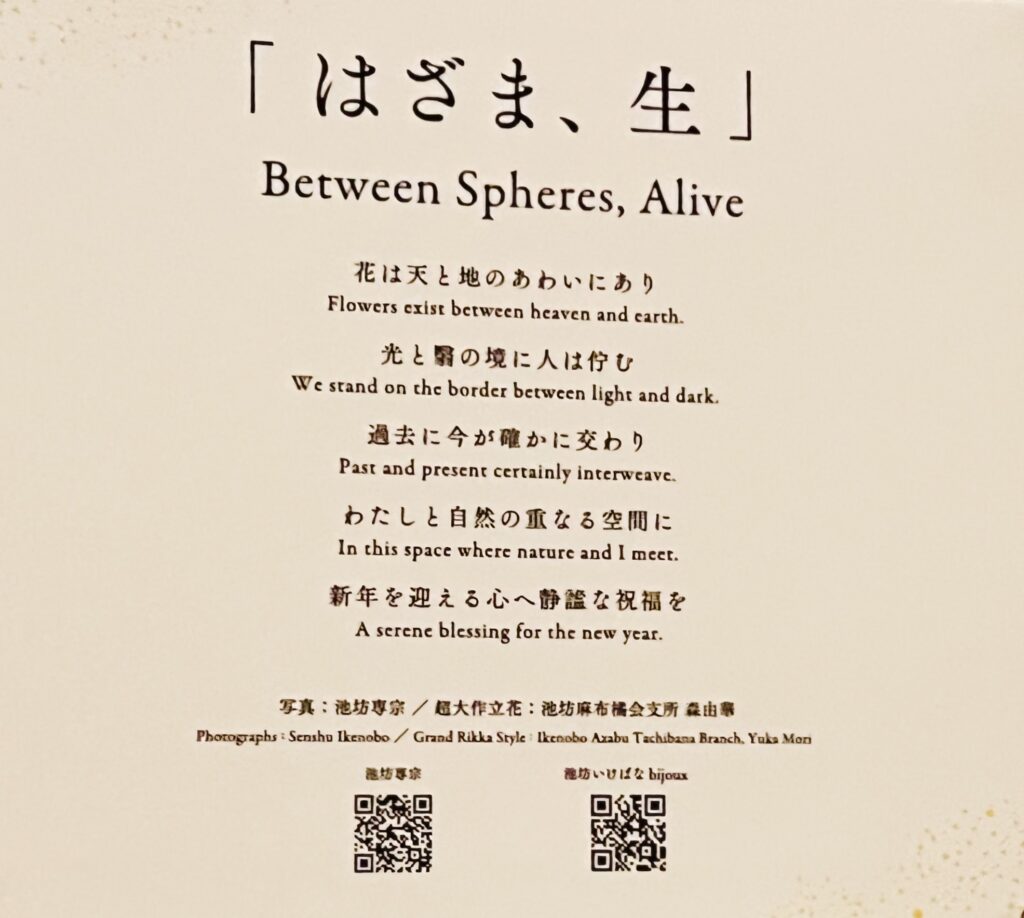 年末年始 六本木ヒルズにお越しの際は ぜひウェストウォーク南で 「 はざま、生 」をご覧くださり 池坊いけばなの「花の力」を感じていただければ幸いです