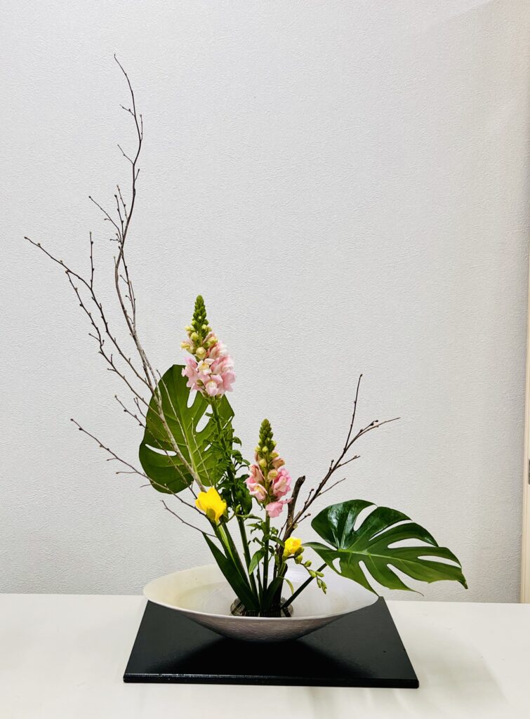 そのモンステラをどのように生けようかと試行錯誤していたのですが、最後に先生が裏返して格好良く手直ししてくださいました❗️