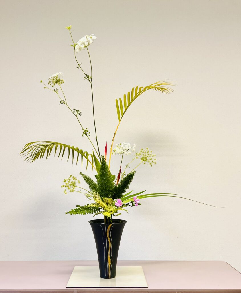 カリキュラム2は、1よりもぐっと豪華で、円を描くような立体的な構成となり、その奥深さを感じながら生けることができました。