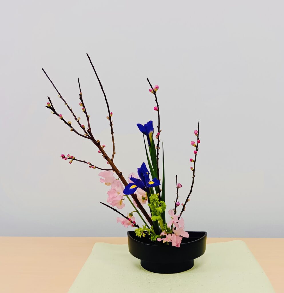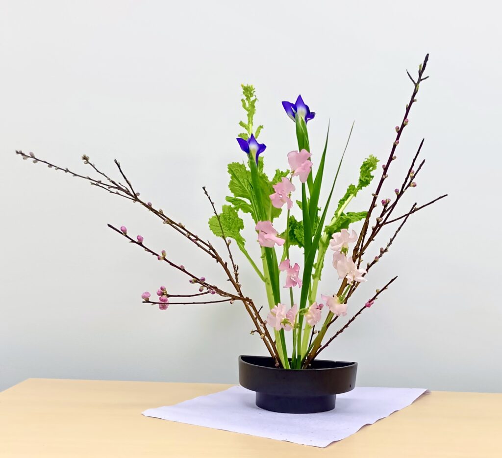 桃の花は、見た目は可憐ですが、実際に触ってみて、力強く生命力があるのを実感していただけたのではないかと思います。同じ花材でも生けた方の個性が出ていて、お互いに鑑賞するのも楽しい時間です。