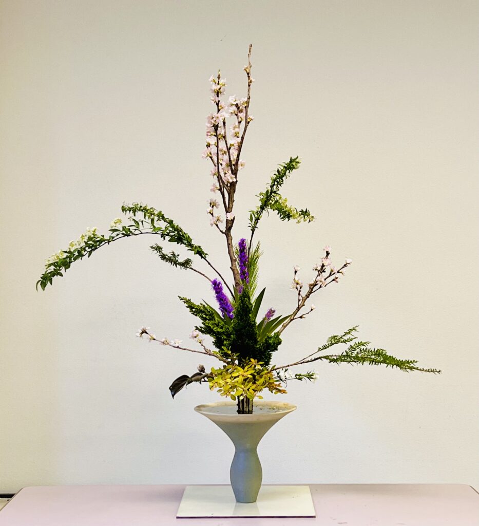 花材 彼岸桜、小手毬、リアトリス、その他